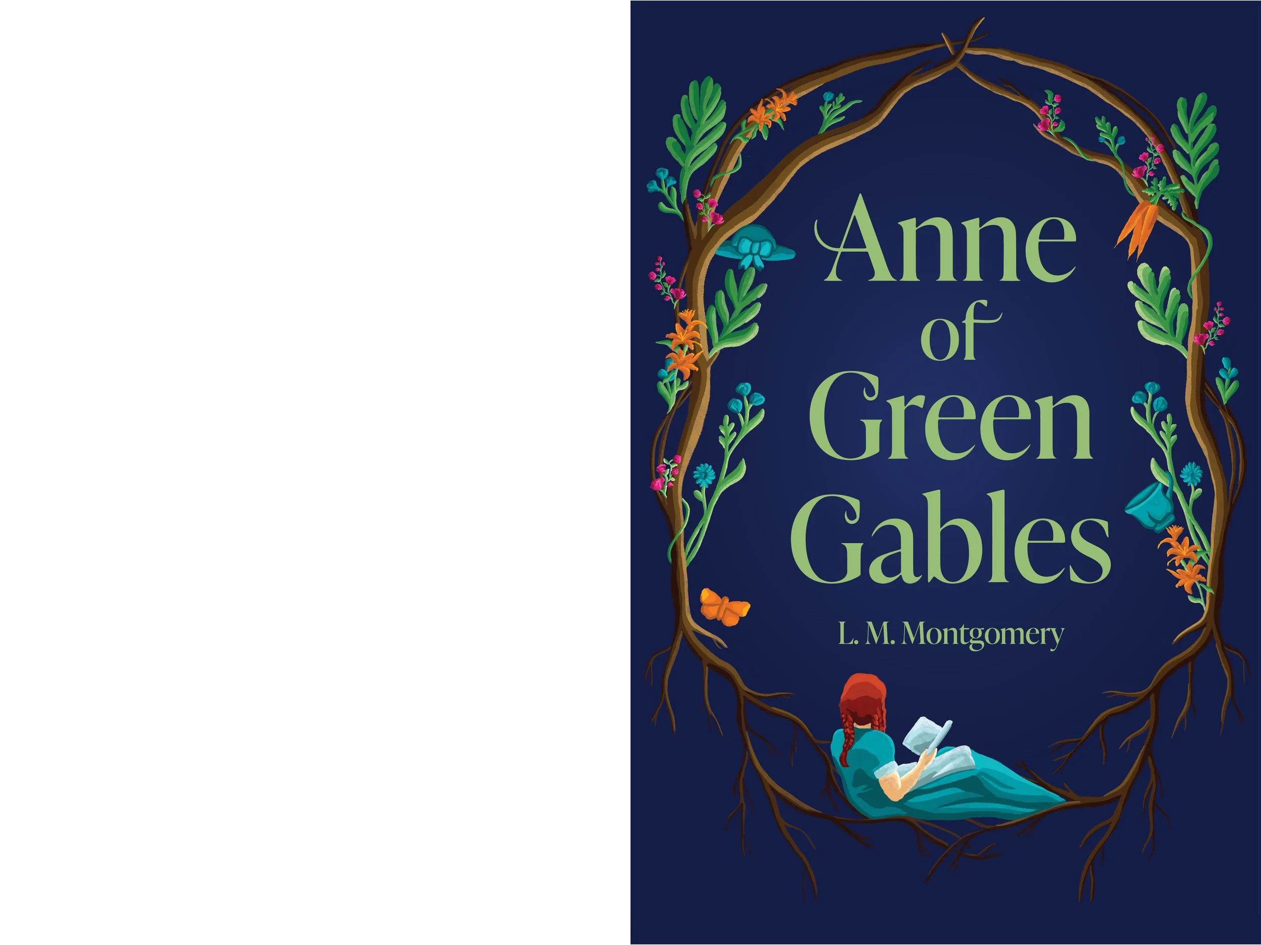 The front cover of the book creates an abstract scene of Anne being cradled by the roots of a tree. This represents her setting down her roots in Avonlea for the first time in her life.